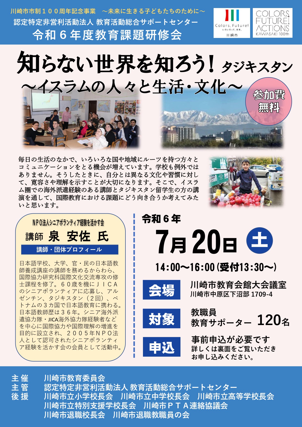 主催者:主催:川崎市教育委員会、主管:認定特定非営利活動法人教育活動総合サポートセンター 、後援:川崎市立小学校長会、川崎市立中学校長会、川崎市立高等学校長会、川崎市立特別支援学校長会、川崎市PTA連絡協議会、川崎市退職校長会、川崎市退職教職員の会 開催日: 2024年07月20日 時 間:14:00-16:00(受付13:30~) 場 所:川崎市教育会館大会議室(川崎市中原区下沼部1709-4)