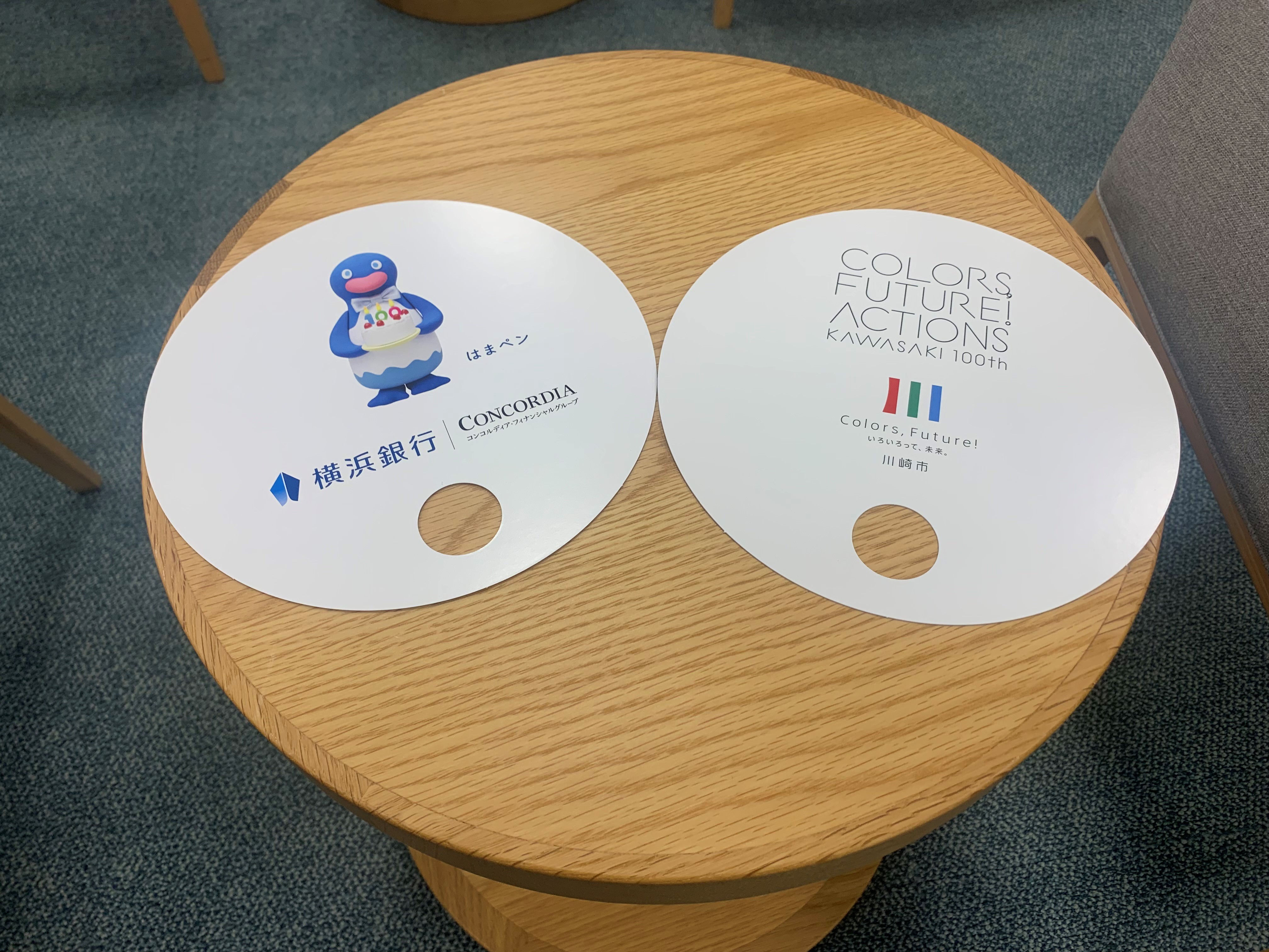 横浜銀行は川崎市制100周年を記念し、100周年記念ロゴと当行キャラクターをデザインしたうちわを配布…