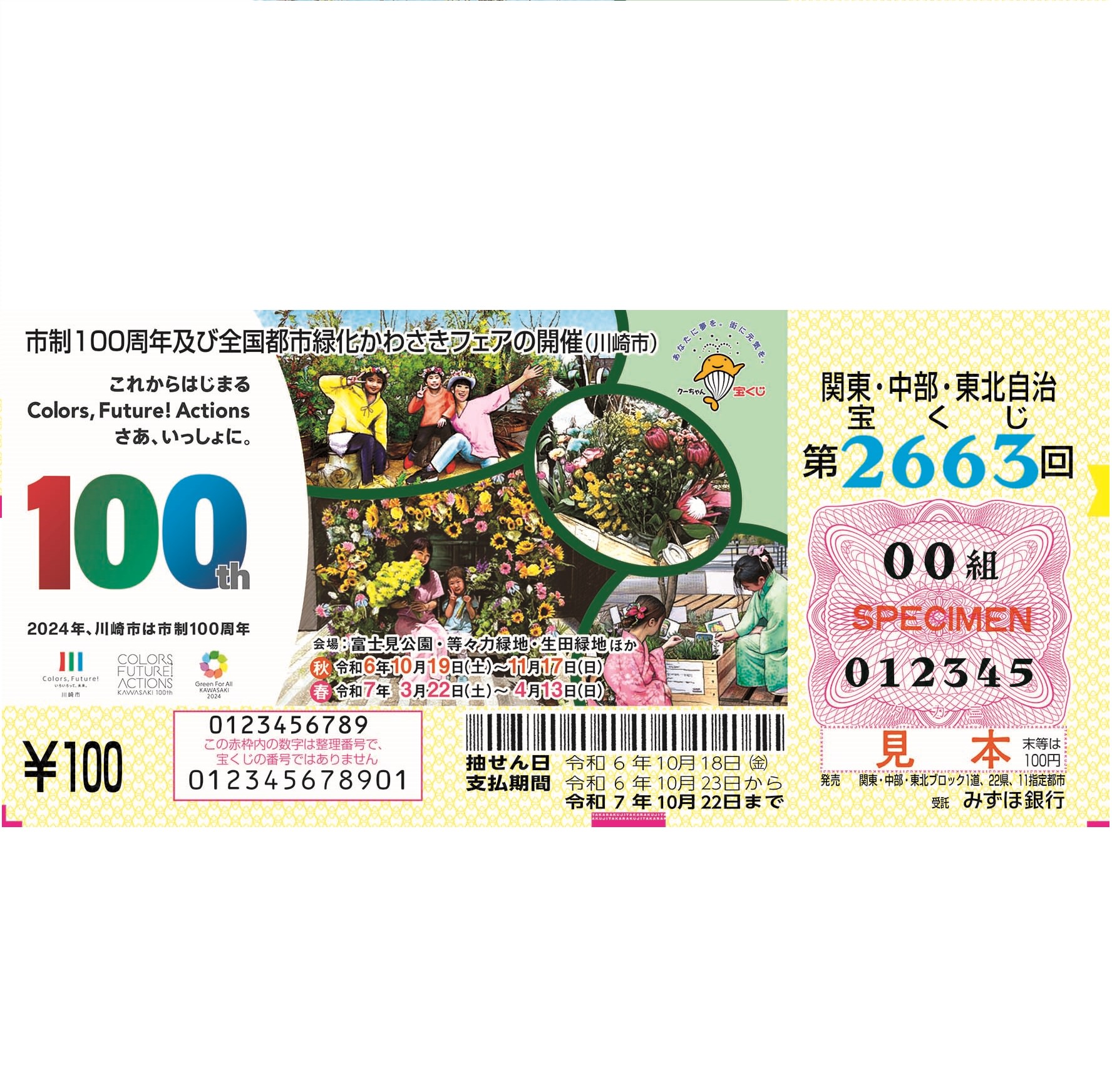 市制100周年&全国都市緑化かわさきフェア開催デザインの宝くじ発売中!