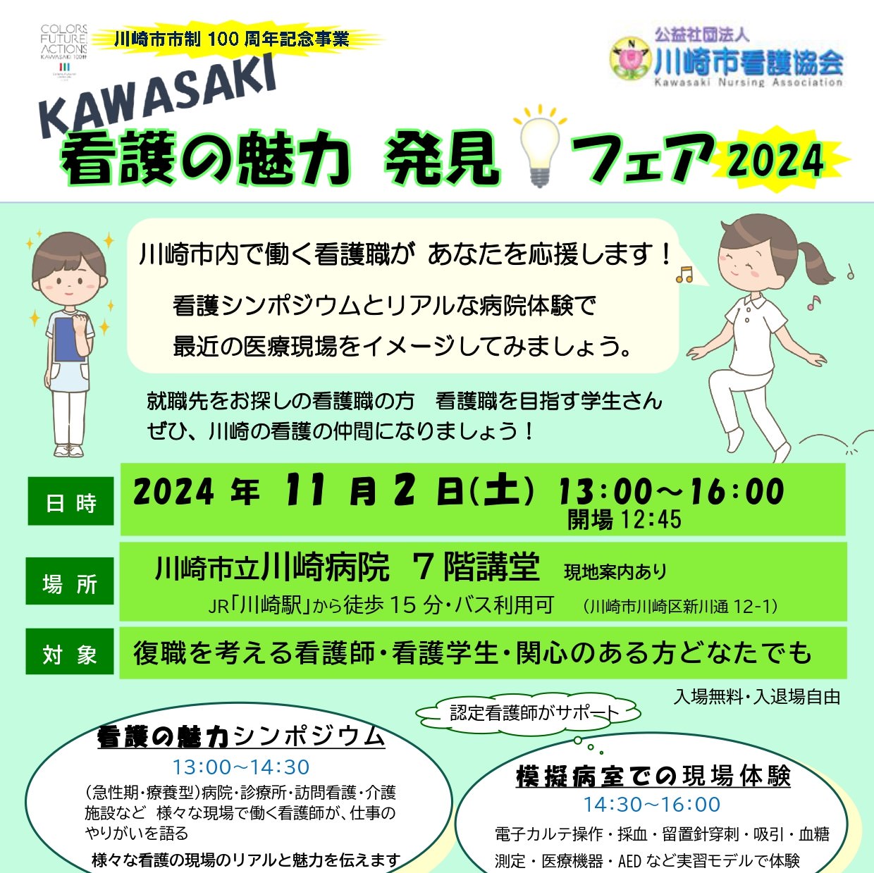 主催者:共催:川崎市、川崎市医師会、川崎市病院協会、神奈川県訪問看護ステーション協議会川崎ブロック、神奈川県老人保健施設協会看護部川崎ブロック、川崎市老人福祉施設事業協会 後援:神奈川県看護協会 主管:川崎市看護協会 開催日: 2024年11月02日 時 間:13:00~16:00 場 所:川崎市立川崎病院 7階講堂