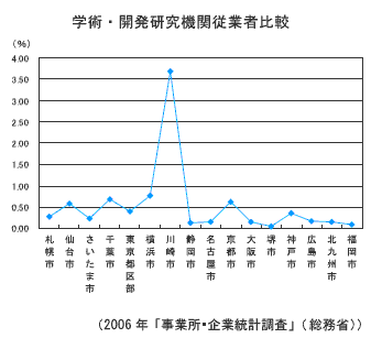 本市の全産業に占める「学術・開発研究機関の従業者数」の割合は3.68%となっており、大都市平均0.43%の8倍の水準となっています。