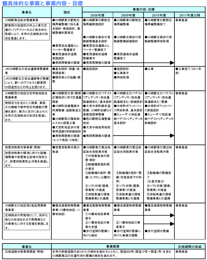 - こうした中で、駅周辺の回遊性・利便性の向上やバリアフリー化、放置自転車対策などの課題に対して取り組むことにより、川崎市の中心的な広域拠点としてその機能強化を推進する必要があります。