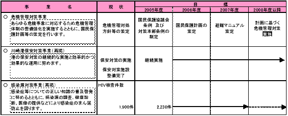 - 武力攻撃等における国民の保護のための措置に関する法律に基づく「武力攻撃事態等に備えた市民の保護のための措置の実施に関する計画」(いわゆる「国民保護計画」)の策定にあたっては、国民保護協議会条例及び国民保護のための措置を総合的に推進するための対策本部条例の制定を2005年度に行い、2006年度末までに国民保護計画を策定します。さらにその後、これに基づく避難マニュアルを策定し、県をはじめとする近隣自治体との協調により、武力攻撃等の際的確かつ迅速に対応できるような体制を整えます。
