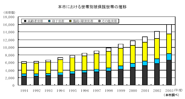 - 生活保護制度は憲法第25条に規定する国民の最低限度の生活を保障するとともに、その自立を助長することを目的としていますが、景気の低迷、少子高齢化、母子世帯の増加等により2003年の15,507世帯から、2004年9月現在で16,049世帯と、対前年比3.5%増加しており、被保護世帯は依然として増加の傾向を示しています。