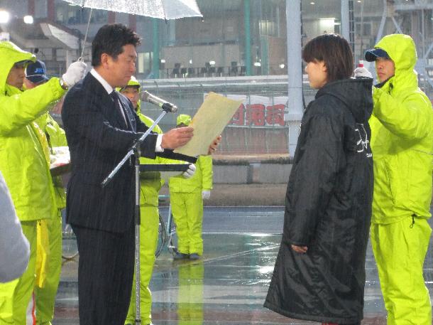 川崎市制90周年事業として、平成27年1月19日から21日に川崎競輪場で開催した「坂本九カップ」の表彰式に出席しました。表彰式には坂本九さんの夫人である柏木由紀子さんも出席しました。当日は、あいにくの雨の中でしたが、熱戦が繰り広げられ、S級は川村晃司選手、ガールズ競輪は小林優香選手が優勝し、市長から賞状と副賞(市長賞)が贈られました。また、柏木由紀子さんからは、トロフィーが贈られ、選手へのお祝いと来場されたお客様への感謝の言葉をいただきました。