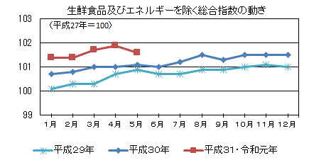 令和元年5月の川崎市消費者物価指数は、平成27年を100とした総合指数で101.6となり、対前月比が0.3%の下落、対前年同月比が0.8%の上昇となりました。