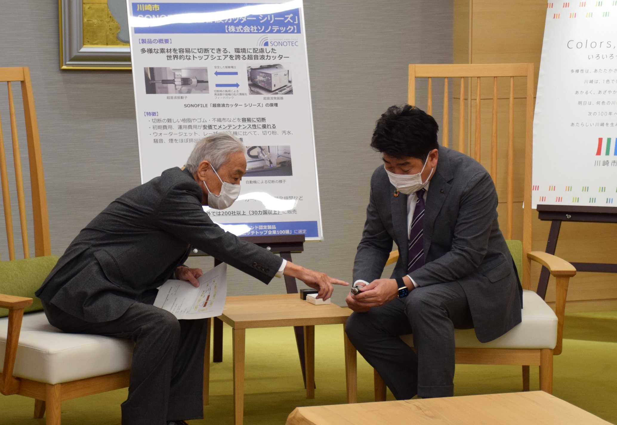 今年度、本市内の企業では株式会社ソノテック(川崎市高津区)が受賞しました。同社は、多様な素材を煙やゴミをほぼ排出せず切断できる超音波カッターを開発しており、世界的なトップシェアを誇ります。今年度は新型コロナウイルス感染症の影響により、九都県市合同での表彰式が実施されないため、市長から表彰状と記念品を授与しました。