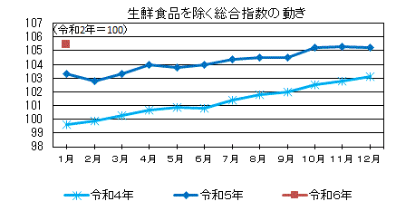 令和6年1月の川崎市消費者物価指数は、令和2年を100とした総合指数で105.8となり、対前月比は0.2%の上昇、対前年同月比は2.1%の上昇となりました。