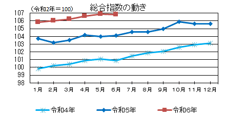 令和6年6月の川崎市消費者物価指数は、令和2年を100とした総合指数で106.8となり、対前月比は同水準、対前年同月比は2.6%の上昇となりました。