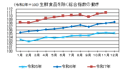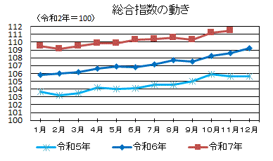 令和7年11月の川崎市消費者物価指数は、令和2年を100とした総合指数で111.5となり、対前月比0.3%の上昇、対前年同月比は2.6%の上昇となりました。