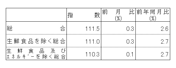 | 生鮮食品を除く総合 | 111.0 | 110.6 | 108.0 | 0.3 | 2.7 |