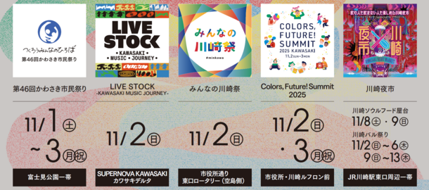 その第1歩として、将来的に国内最大級のイベントの実現を目指し、100周年を契機に生まれた「Colors,Future!Summit」、「みんなの川崎祭」に加え、「かわさき市民祭り」、「川崎夜市」、初開催の音楽ライブイベント「LIVE STOCK」の5つのイベントを、「101 - Next New Challenge - 次の100年へ向けた、新たな挑戦のはじまり」という共通テーマを掲げて「川崎 秋の5大イベント」として同時開催しました。