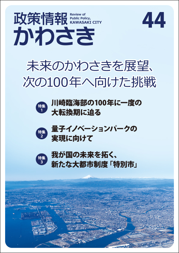 第44号は、「未来のかわさきを展望、次の100年へ向けた挑戦」をテーマとし、大転換期を迎える川崎臨海部、量子イノベーションパーク、新たな大都市制度「特別市」の3つに焦点を当てて特集し、川崎の未来を展望する構成となっています。