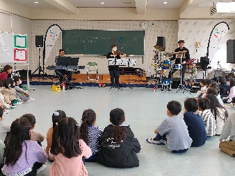 1年生と2年生の全児童が、学年ごとにクラス合同で音楽ワークショップを体験します。