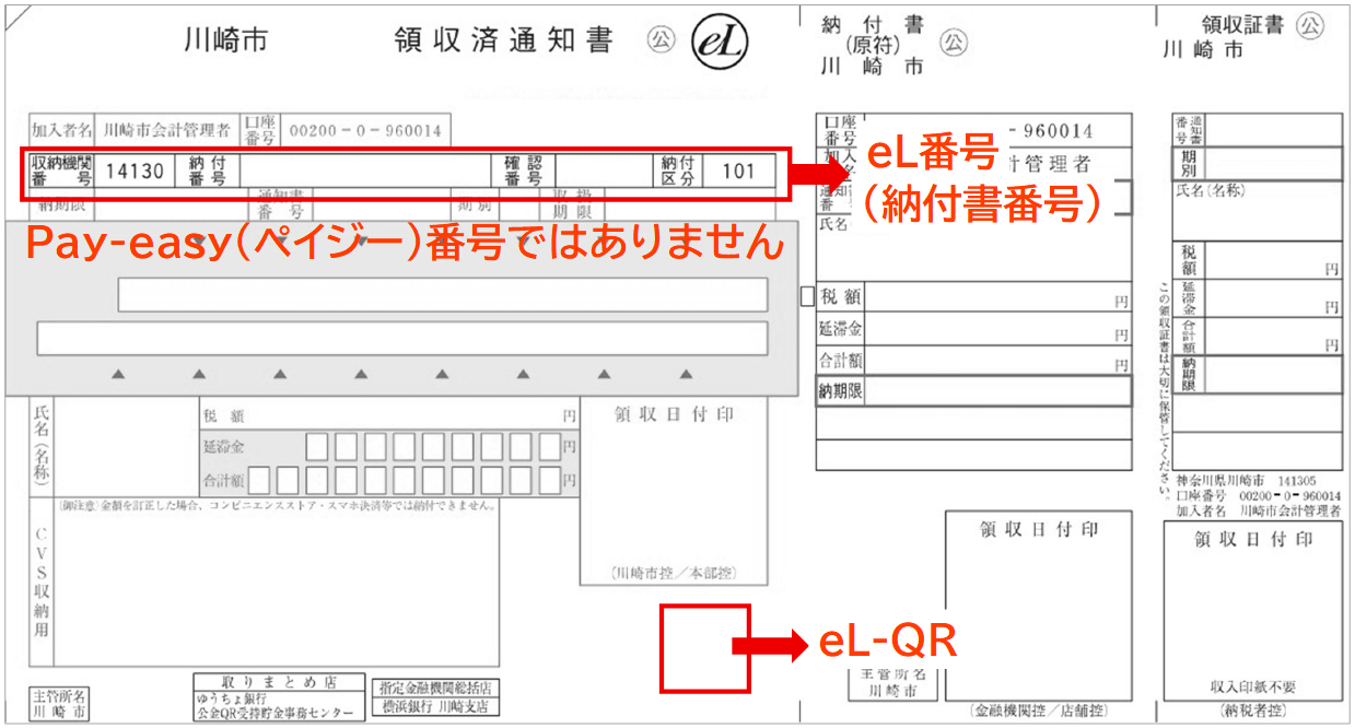 - 金融機関の窓口では、eL-QRが印字された納入書で小切手などの証券による納入が原則できません。金融機関又は支店ごとに対応が異なるため、証券による納入が可能かどうかについては、持込予定の金融機関の支店にご確認いただくか、納入すべき金額が印字されていない納入書(予備の納入書)をご使用ください。