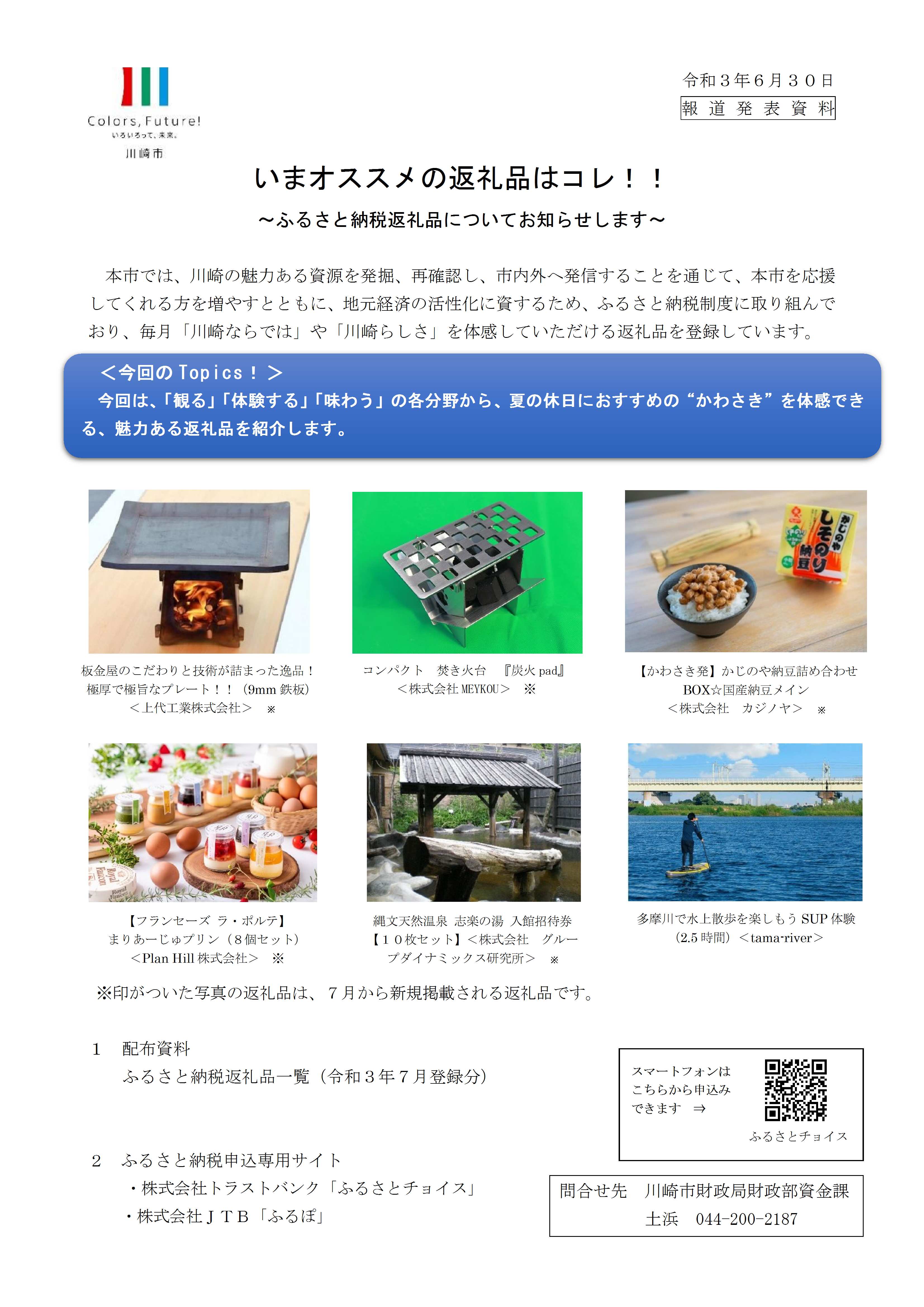 本市では、川崎の魅力ある資源を発掘、再確認し、市内外へ発信することを通じて、本市を応援してくれる方を増やすとともに、地元経済の活性化に資するため、ふるさと納税制度に取り組んでおり、毎月「川崎ならでは」や「川崎らしさ」を体感していただける返礼品を登録しています。