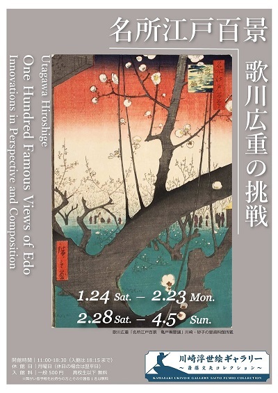 川崎浮世絵ギャラリー(川崎区駅前本町12-1 川崎駅前タワー・リバーク3階/JR川崎駅北口から直結)で2月28日(土)から、江戸時代後期を代表する浮世絵師・歌川広重の描いた錦絵シリーズ《名所江戸百景》を展示する企画展が始まります。