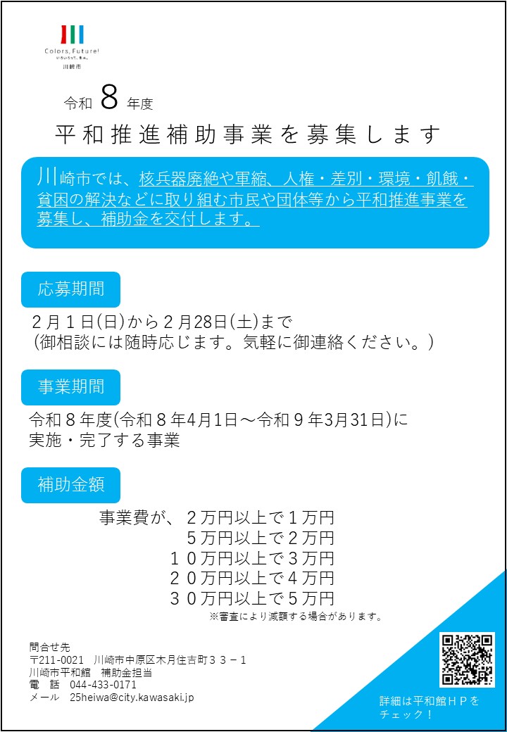 令和8年度川崎市平和館平和推進補助事業に係る補助金募集要領