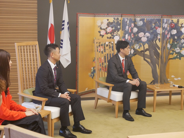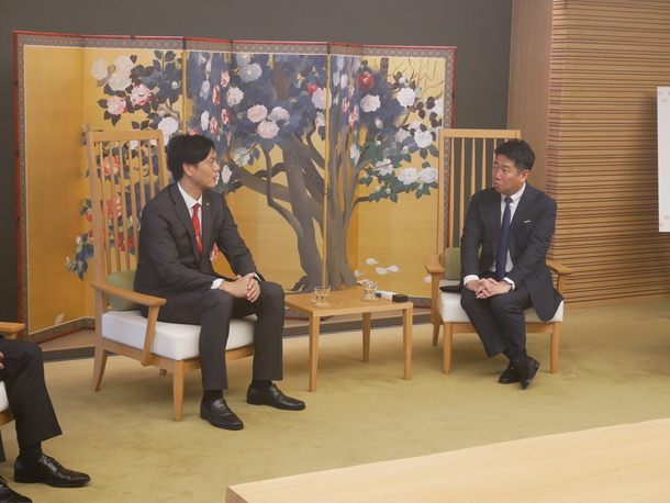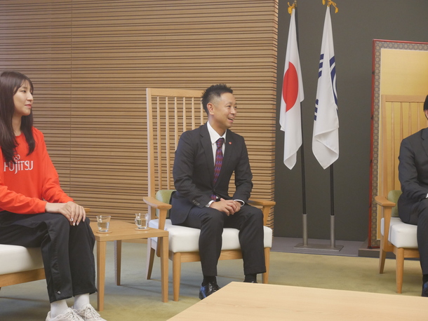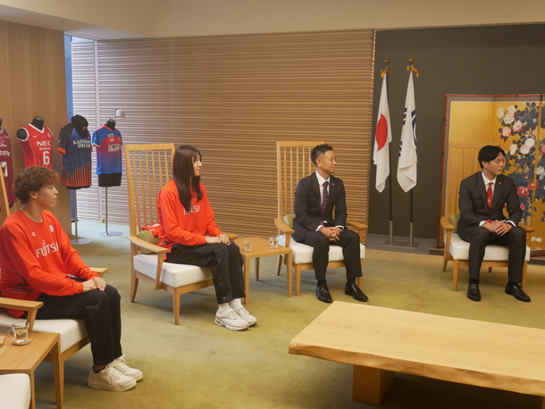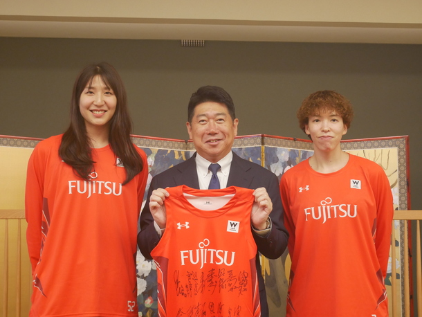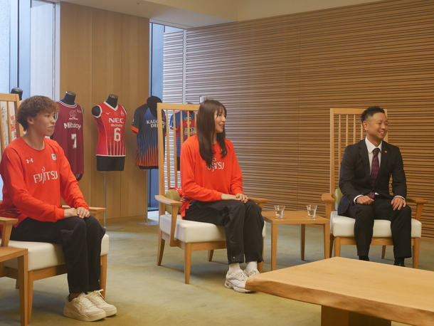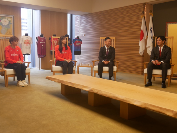 令和7年10月7日(火曜日)、Wリーグ2025-26シーズン開幕に伴い、「かわさきスポーツパートナー」である富士通レッドウェーブの日下光HC、宮澤夕貴選手、林咲希選手を含む、チーム関係者の皆さんが川崎市役所に来庁されました。