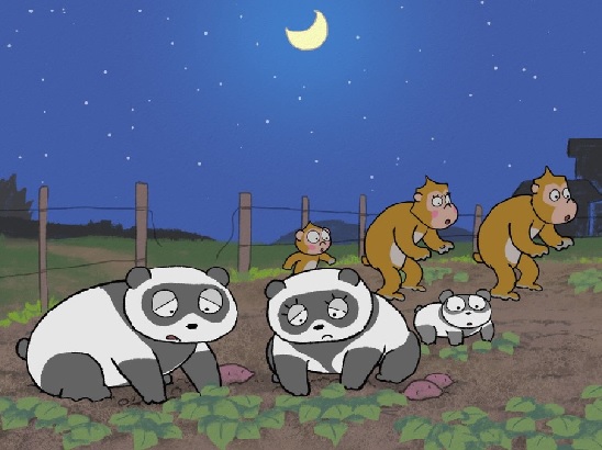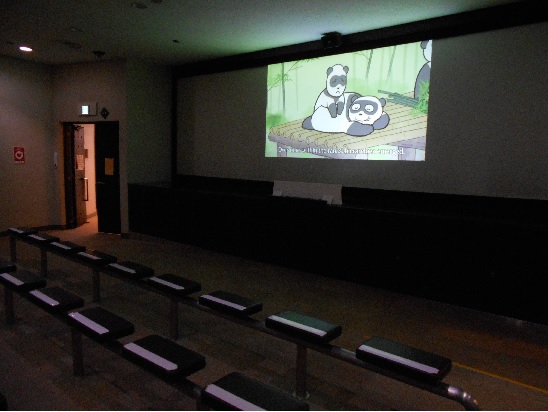 平和を考えるアニメーションを上映しています。架空の竹林を舞台にしたパンダさんとお猿さん、そして人間たちの物語です。