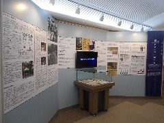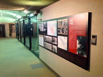 川崎と戦争の関わりについて解説しています。コーナーのはじめでは、頭上から焼夷弾が落下してくる様子をご覧いただけます。映像室の中には、部屋の模型を使った戦時中の市民生活の解説や、高津区久末に残る「海軍東京通信隊蟹ヶ谷分遣隊地下壕」の当時を再現した模型があります。また、市民から寄贈された当時の物品や、手に取って触ることができる焼夷弾の模型なども展示しています。