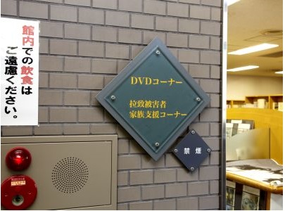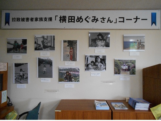 横田めぐみさんの写真を展示しています。関連書籍を読むことや関連DVDを視聴することもできます。