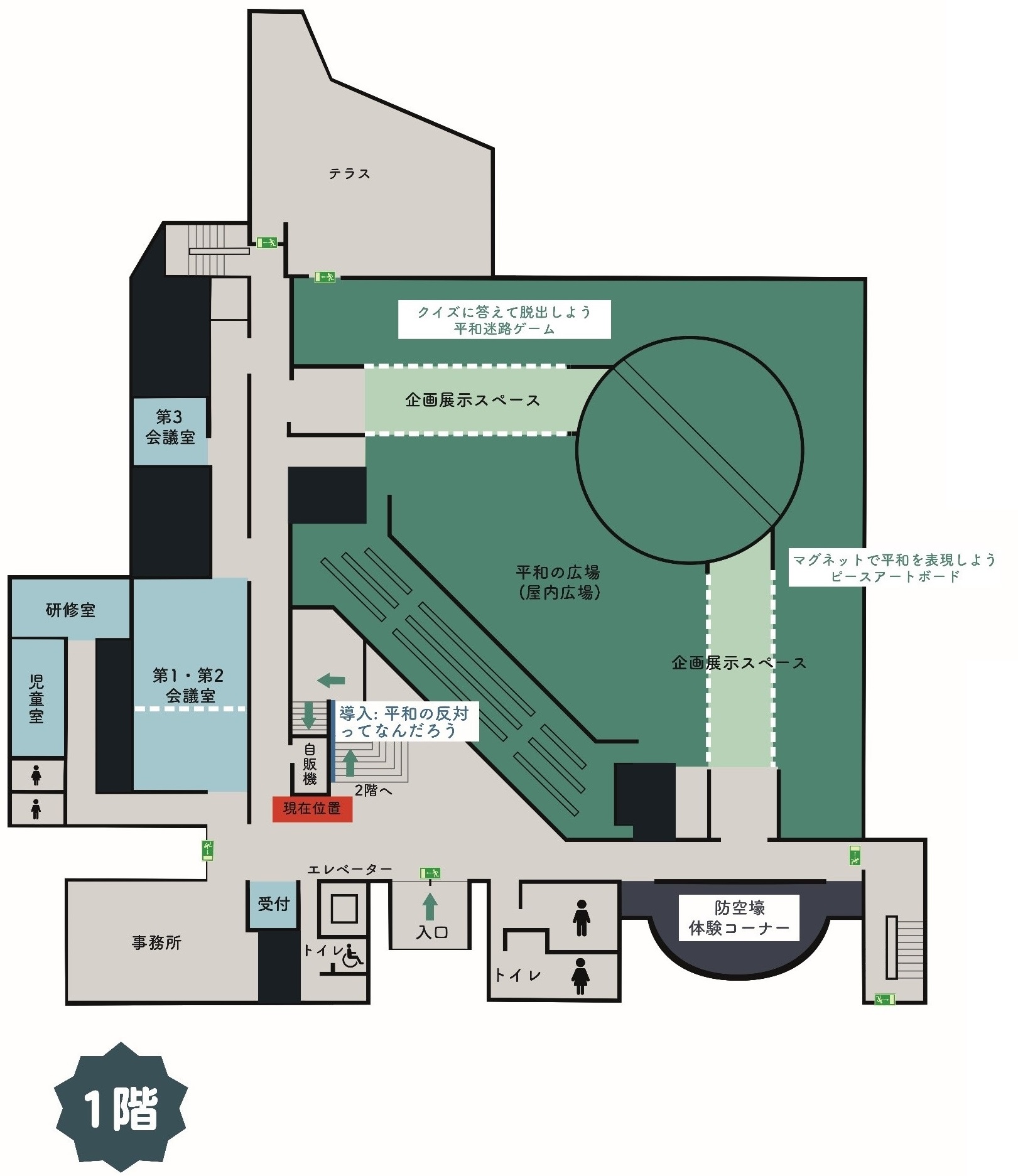 1階を案内します。入口を入り左側には、第1、第2、第3の会議室と研修室があります。入口の右側には、防空壕の体験コーナーがあります。防空壕を出て進むと屋内広場があり、ここでは、川崎大空襲記録展、企画展などの展示が行われます。