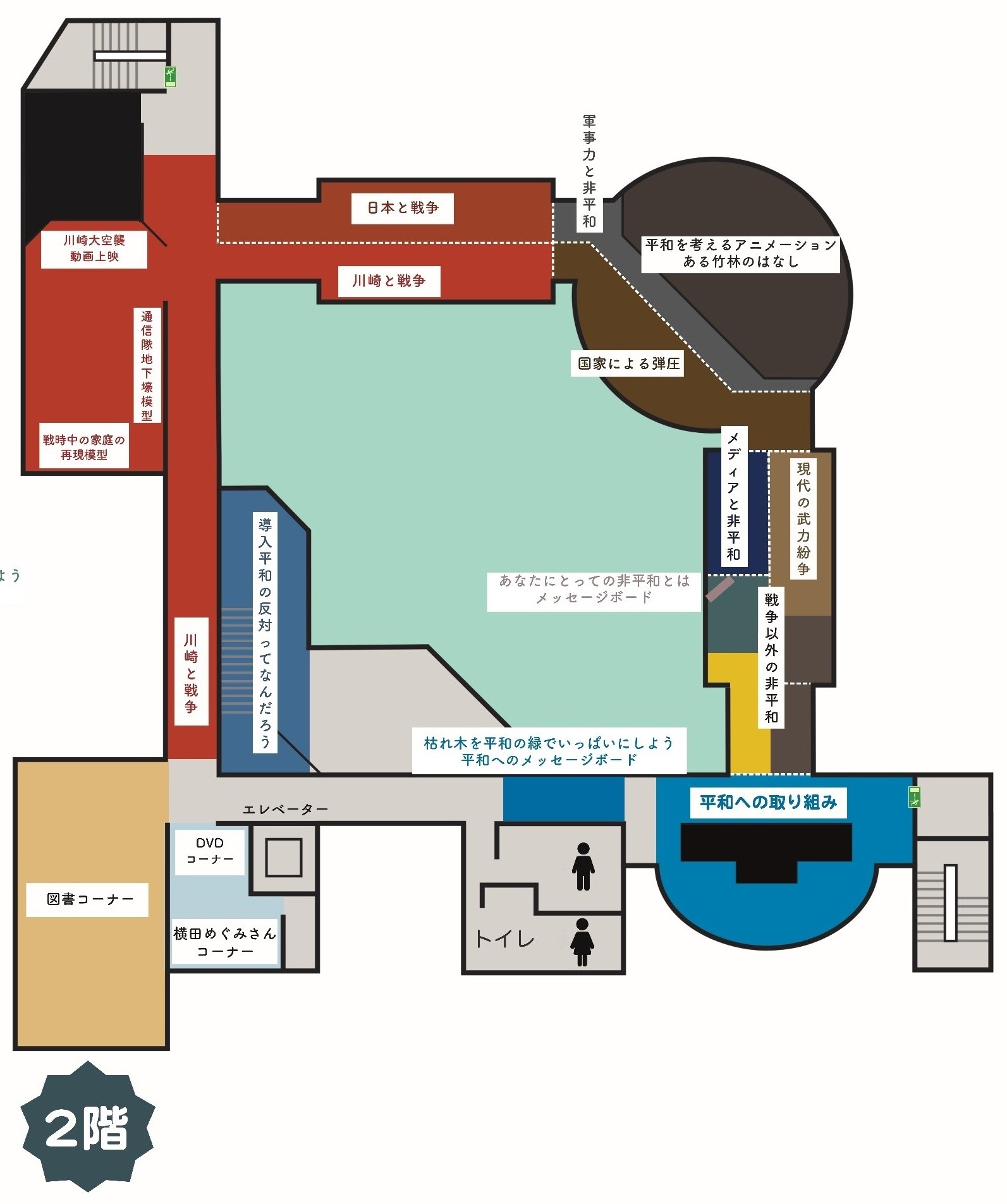 2階を案内します。2階は、ぐるっと一周のできる常設展示場となっています。常設展示は、10のテーマごとに展示コーナーがあります。戦時中の日常生活を物語る実物資料なども展示しており、2つの映像室があります。図書コーナーやDVDコーナー、拉致被害者家族支援「横田めぐみさん」コーナーもあります。