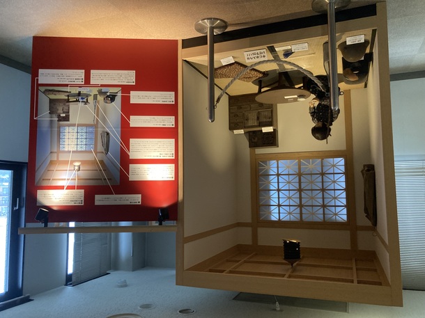 体験コーナーでは、横穴式の防空壕を再現しています。壕内のジオラマでは音と光とにより空襲を体感できます。