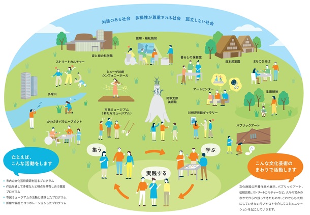 川崎市では、誰もが身近に文化芸術に触れ、参加できる環境「アート・フォー・オール」の実現に向けた取組を進めています。この「アート・フォー・オール」の取組の一環として、川崎市と東京藝術大学とが連携し、川崎のまちをフィールドとして文化芸術を介して、そこに生まれる”こと“と”こと“をつなぎ、人と人や人と場所がつながりあえる「アートコミュニティ」を育むプロジェクト「こと!こと?かわさき」を令和6年度から本格的にスタートしました。このプロジェクトの主体となる、アート(文化芸術)を介して、対話をしながら人・モノ・こと・場所等をつないでいくアートコミュニケータ「ことラー」といいます。