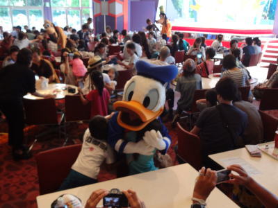 ![]() ▲ディズニーキャラクターがみんなにご挨拶にまわります。 写真をとったり、抱きついたり、みんな楽しそう♪ |