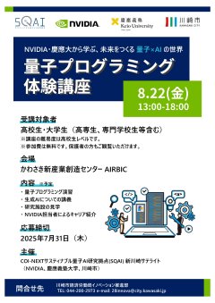 量子プログラミング体験講座 | 令和7年8月22日 | 高校生・大学生向け | COI-NEXTサスティナブル量子AI研究拠点(SQAI) 新川崎サテライト (NVIDIA、慶應義塾大学、川崎市) |