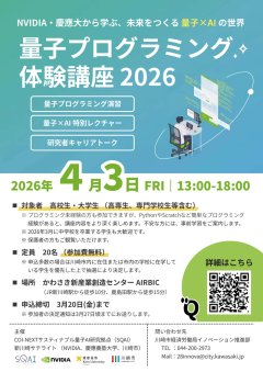 量子プログラミング体験講座2026 (令和8年度プログラム) | 令和8年4月3日 | 高校生・大学生向け | COI-NEXTサスティナブル量子AI 研究拠点(SQAI)新川崎サテライト (NVIDIA、慶應義塾大学、川崎市) |