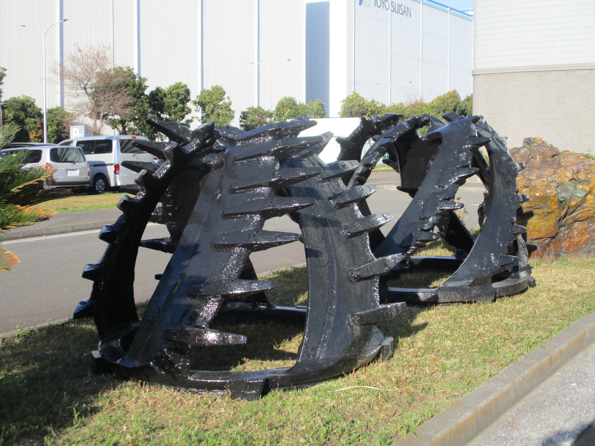 カッターヘッドは、埋め立て事業に活躍したポンプ船に付属していた海底の土砂を切削するためのドリル型機械です。歯の形が明らかに溶接跡のあるほうが京浜埋立事業に参画した「六郷丸」に付属していたもので、最初は歯がなかったのですが、硬質の岩盤の切削のために追加されました。もう一つの新しいほうは最初から歯がついています。サメの顎に似た獰猛な形をしています。