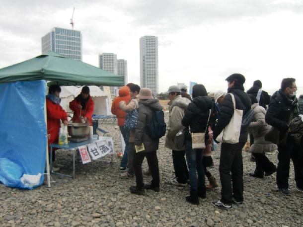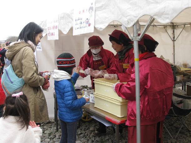 寒さを和らげる甘酒も大人気でした。また、かわさきそだちPRキャラクター「菜果ちゃん」も子どもたちに大人気でした。