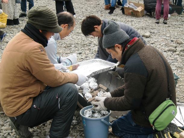たくさんの参加者がドラム缶を囲み、暖かくて美味しい、やきいもを味わっていました。