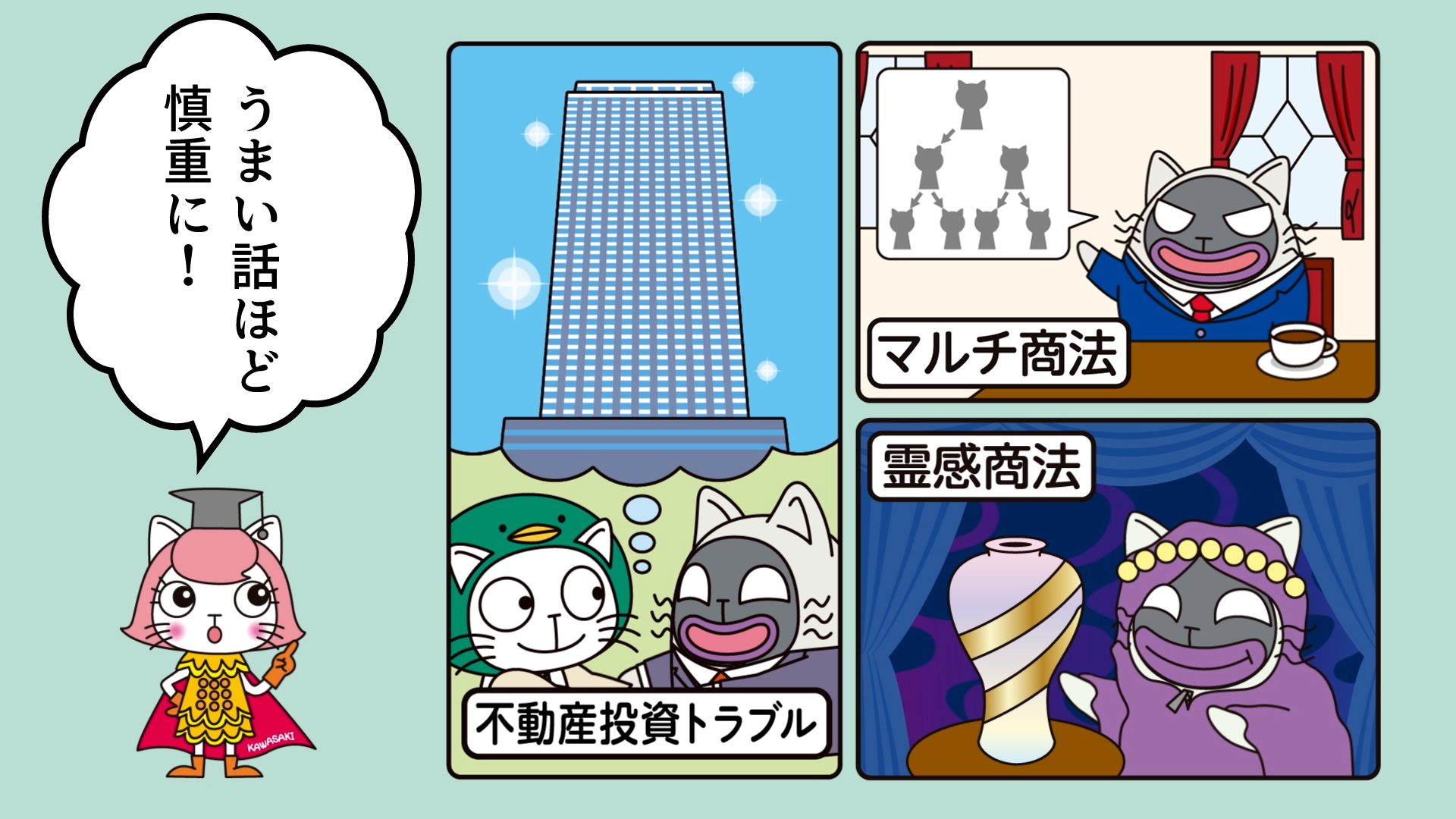 川崎市消費者行政センターのキャラクター「てるみ~にゃ」たちによるPRアニメ動画(15秒)を新たに制作しました。動画をWebやSNS広告、トレインチャンネル等を通じて放映し、よくある悪質商法について注意喚起するとともに、トラブルにあったら消費者トラブルホットライン「188」にご相談いただくよう周知を行います。