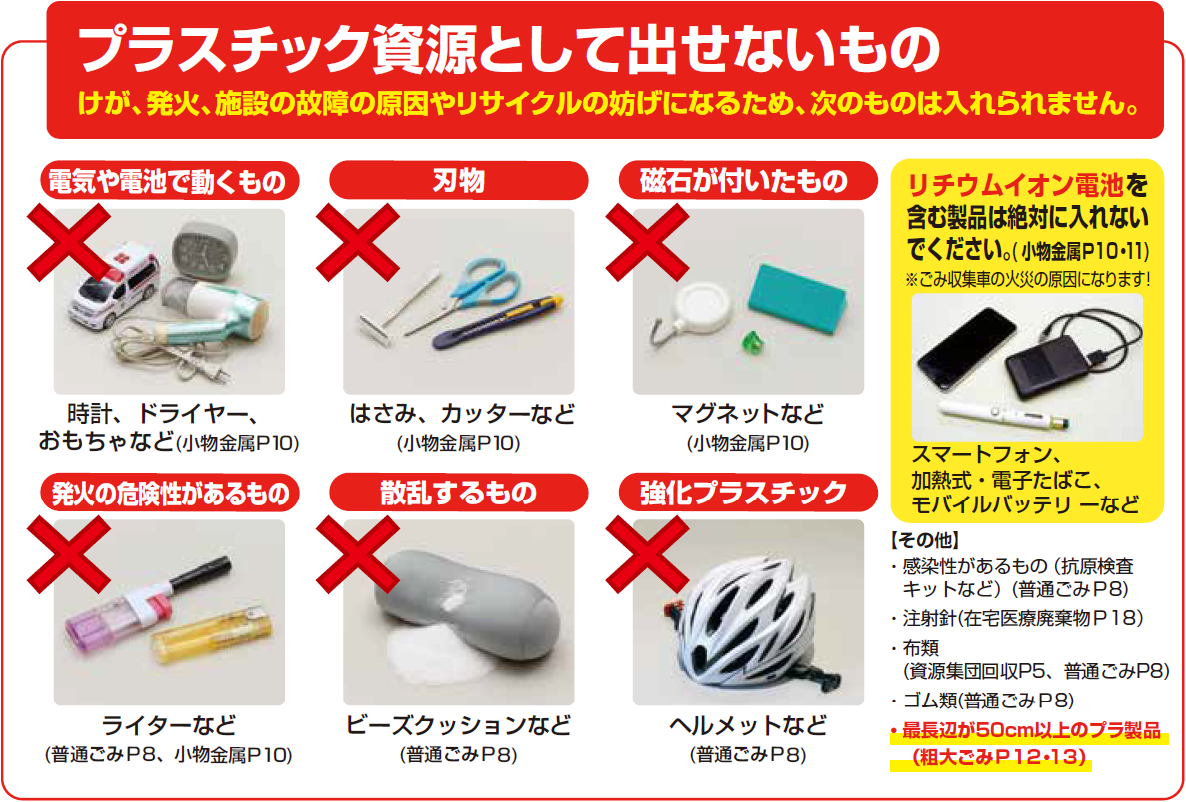 注射針(在宅医療廃棄物)、布類(資源集団回収、普通ごみ)、ゴム類(普通ごみ)、最長辺が50cm以上のプラスチック製品(粗大ごみ)も対象外です。