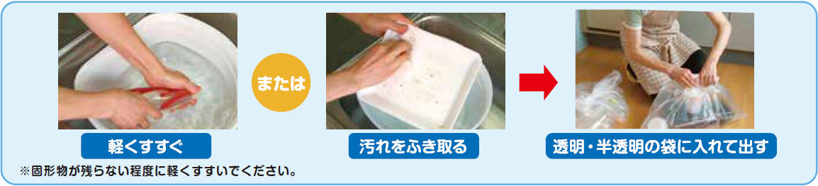 中身を使い切って、軽くすすぐか、汚れをふき取ってから、透明・半透明の袋に入れて出してください。