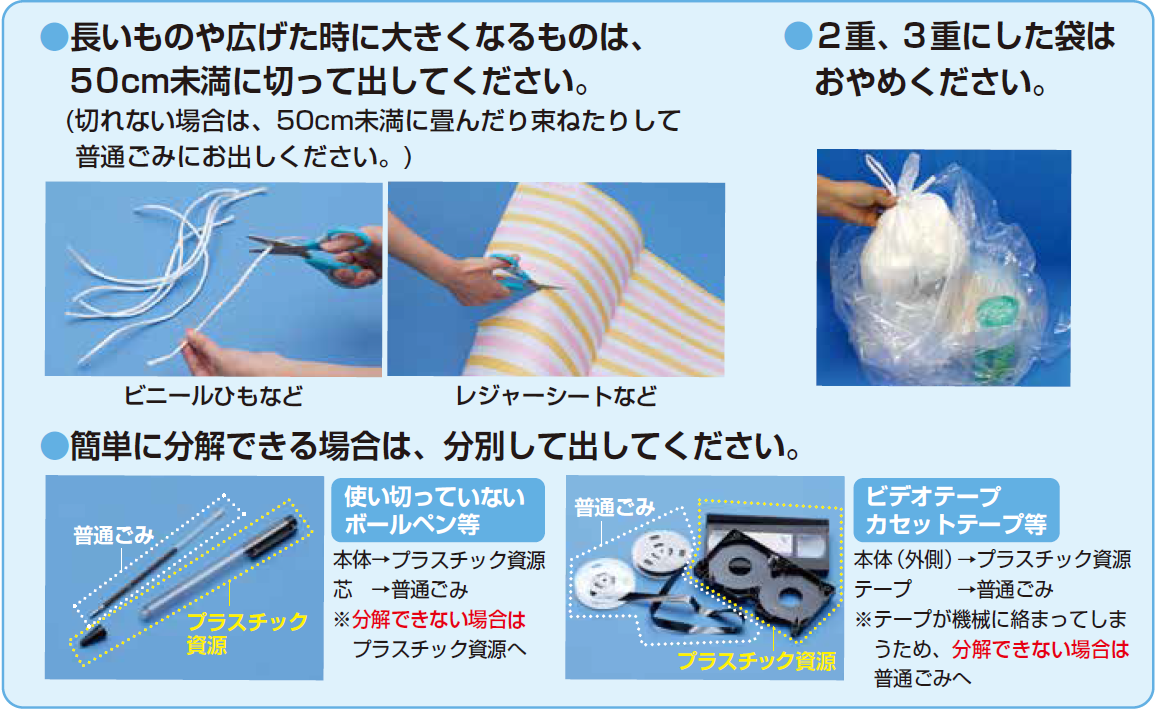・ビニールひも、レジャーシートなどの長いものや広げた時に大きくなるものは、50cm未満に切って出してください。(切れない場合は普通ごみに出してください。)