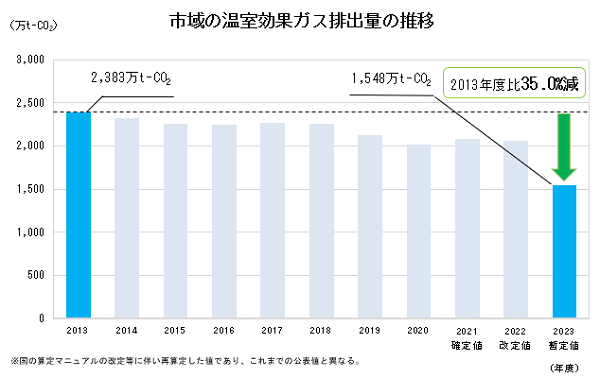 市域の2023年度(暫定値)の温室効果ガス排出量は、1,548万トン(二酸化炭素(CO2)換算。以下同じ。)。