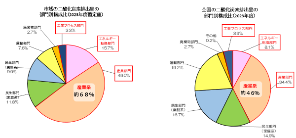 部門別二酸化炭素排出量の排出割合は、産業系(産業部門、エネルギー転換部門、工業プロセス部門)が約7割と大きな割合を占めており、全国平均と比べても非常に大きいことがわかります。