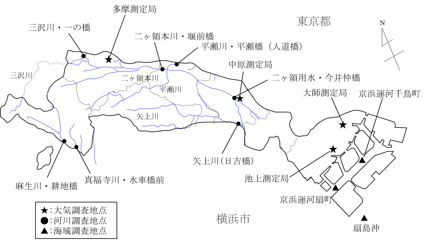| 三沢川 一の橋 | 二ヶ領本川 堰前橋 | 二ヶ領用水 今井仲橋 | 平瀬川 平瀬橋 | 麻生川 耕地橋 | 真福寺川 水車橋前 | 矢上川 日吉橋 | |