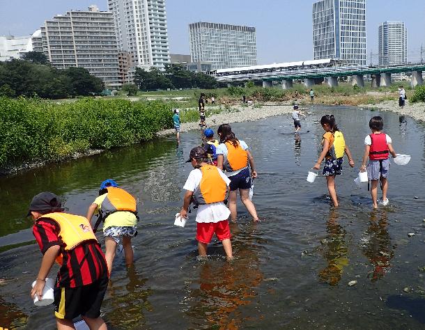 夏休み多摩川教室は、主に多摩川の沿川に住む小中学生を対象として、多摩川とさまざまな形でふれあうことにより、多摩川の水質や自然環境、防災等について興味や関心を深める機会としていただくため、平成3年から実施している催しです。毎回、生きもの観察や川遊び体験、川の模型実験など、各行政・協力団体がさまざまなテーマで参加型、体験型の出展を行っております。(イベント主催:多摩川流域協議会、事務局:国土交通省関東地方整備局京浜河川事務所)