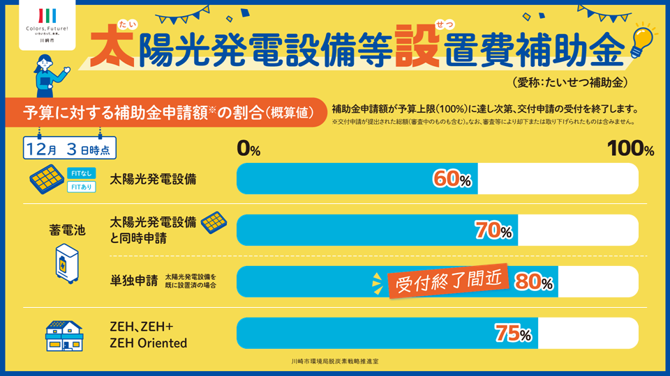 詳細は、「川崎市太陽光発電設備等設置費補助金交付要綱」「太陽光発電設備等設置補助金申請の手引き」をご確認ください。