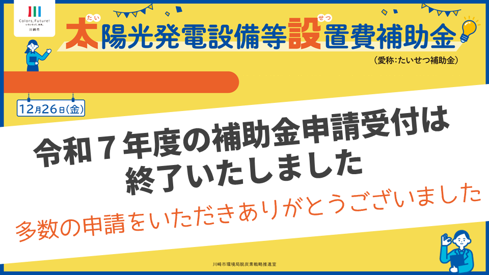 - 根拠となる条例・規則・要綱等:川崎市太陽光発電設備等設置費補助金交付要綱 第12条