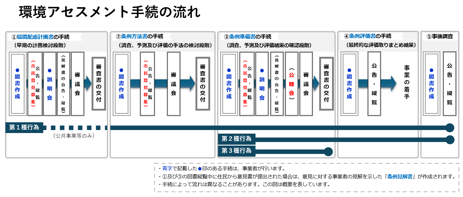 - 環境アセスメント制度は、事業が周辺の影響に及ぼす影響について事業者が調査・予測・評価した結果をアセス図書にまとめたものに対し、市民の方々に環境の保全の見地からの意見を求めるもので、事業そのものの中止や見直しを求めるものではありません。