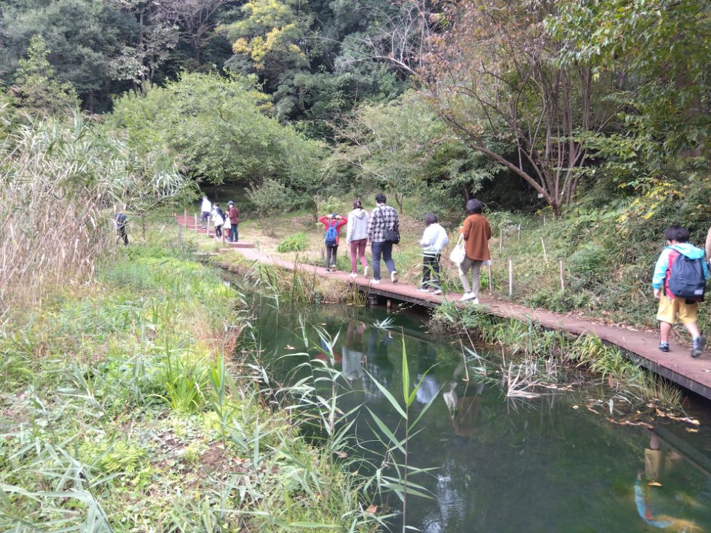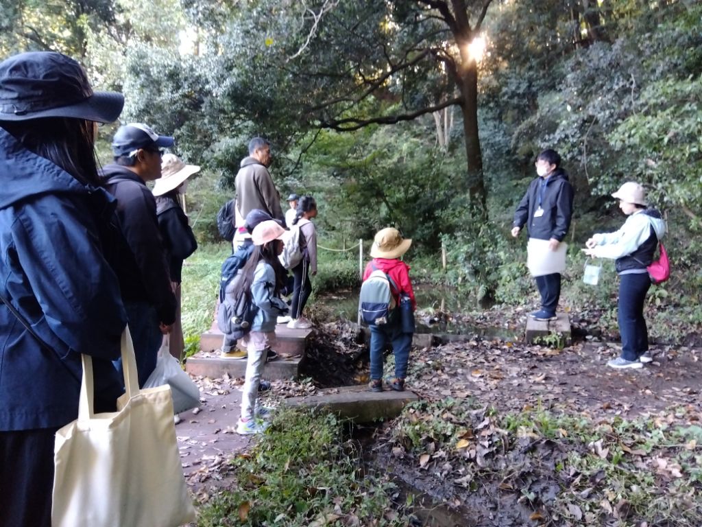 湧水地編では麻生区はるひ野にある黒川よこみね緑地でフィールドワークを行いました。緑地の保全活動を行っているボランティア団体「水辺のある里山を守る会」を講師として招いて、緑地や湧水地の紹介を行っていただきました。