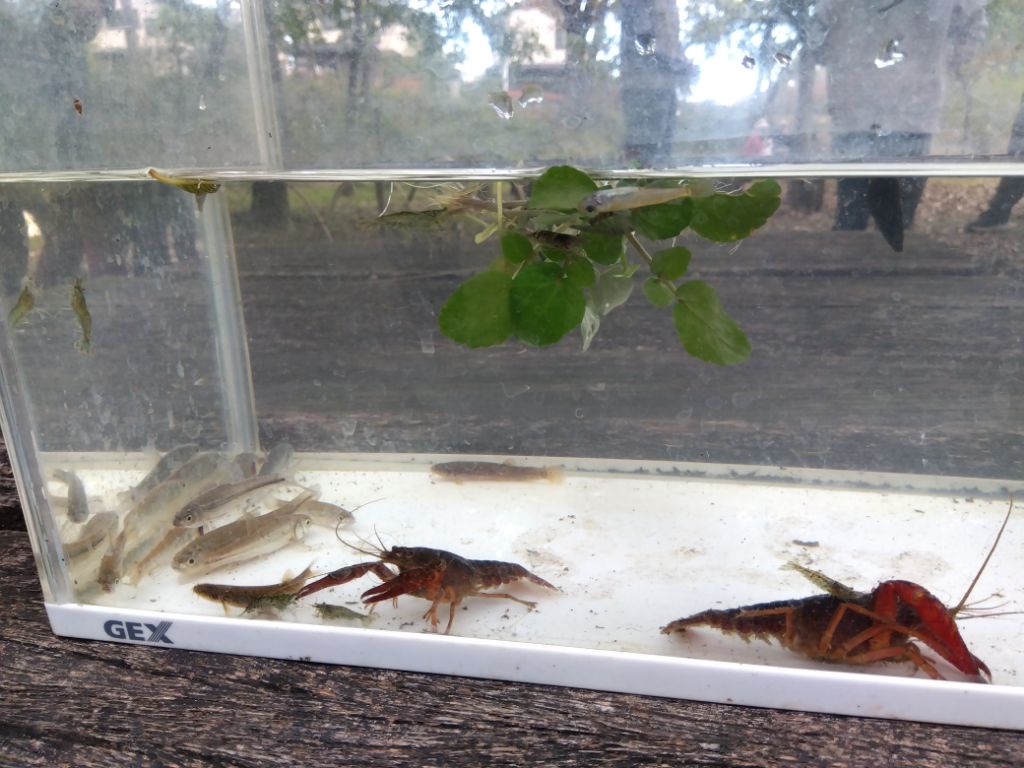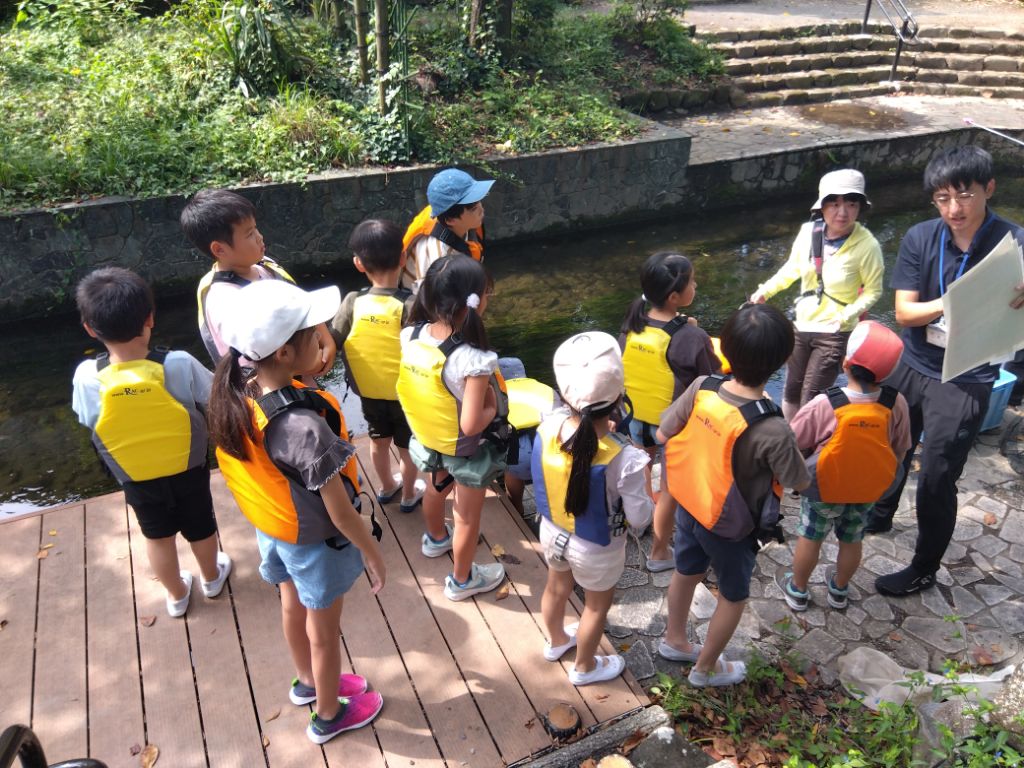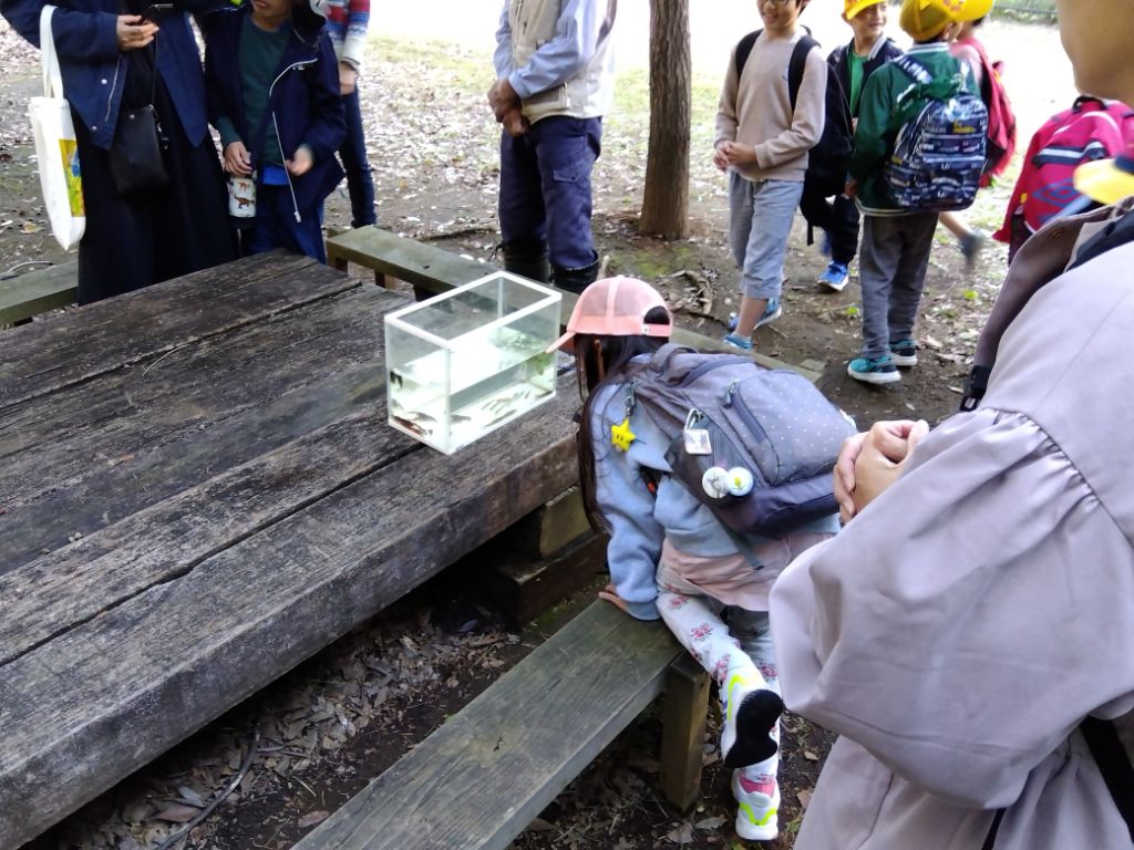 湧水地編では、カワニナ、ドジョウなどの水生生物と触れ合ったり、観察してもらいました。また、ホトケドジョウ等の絶滅危惧種や、アメリカザリガニ等の外来種の観察を通じて外来種問題についても学んでもらいました。