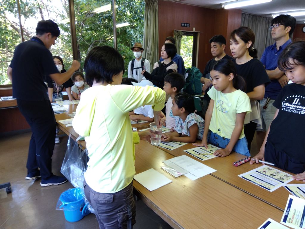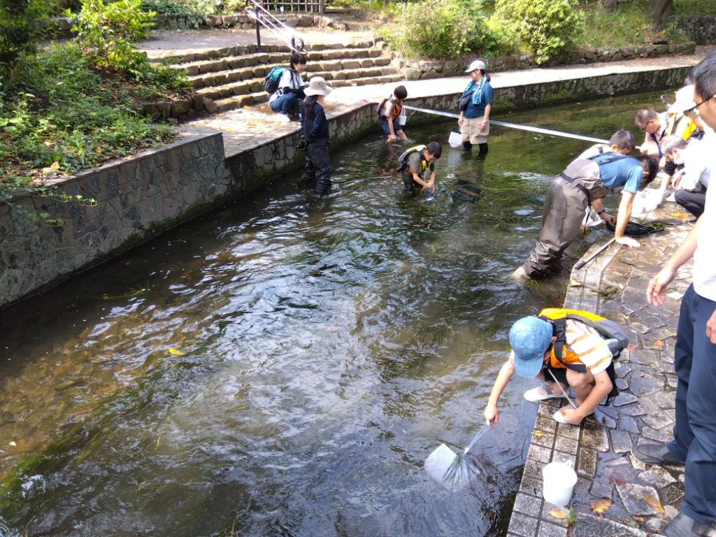 川編では、アユ、オイカワなどの魚類や、ヌマエビ、ヤゴ等の底生生物を観察してもらいました。
